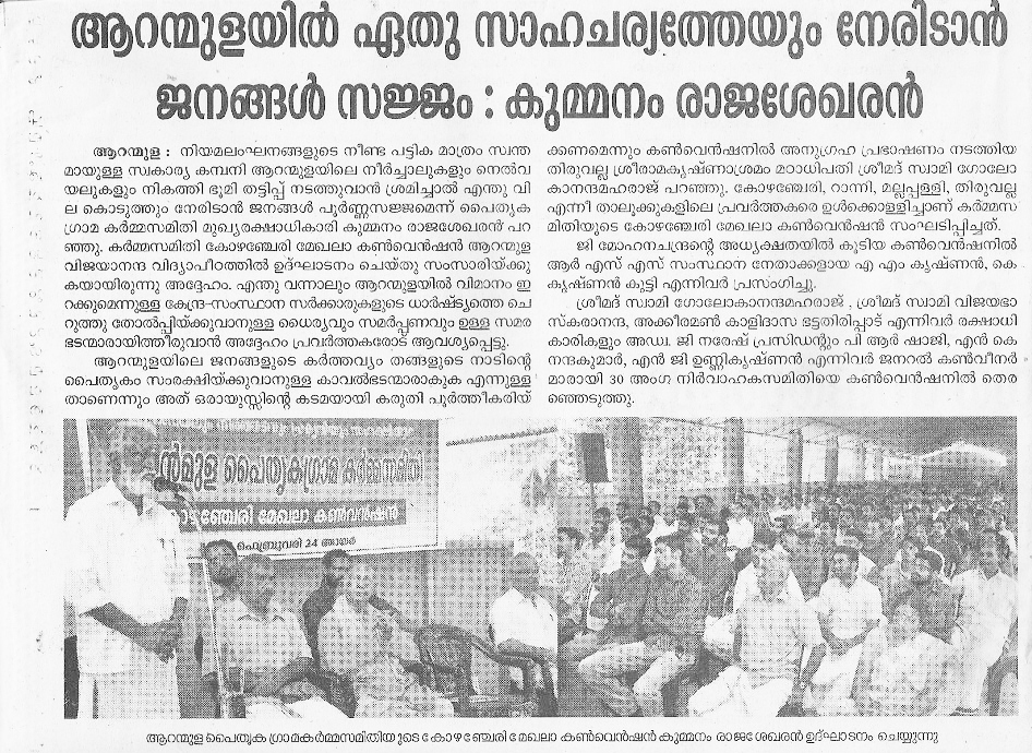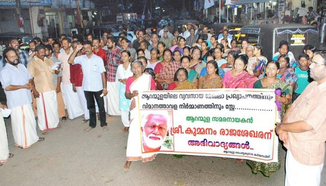 Some industrialists from outside Kerala felt that Kerala could be further developed, and it was Aranmula that they selected for the purpose. If an international airport comes up there, Sabarimala will develop and Kerala will get revenue.The people who migrated from Central Travancore to the USA, Germany and Gulf countries will be able to travel very comfortably, and so they tried to sow their dreams of development in Kerala. Authorities of the village offices to the Secretaries of Departments stood up in deference attending to the development leaders. Orders to fill the marshy fields and ponds, as well as to level the hills were given at a rapid pace. Whilst preparations to fly to Aranmula on the chariot of development had been ongoing in full swing, Kummanam Rajasekharan reached Aranmula. What happened next was Aranmula's success story.